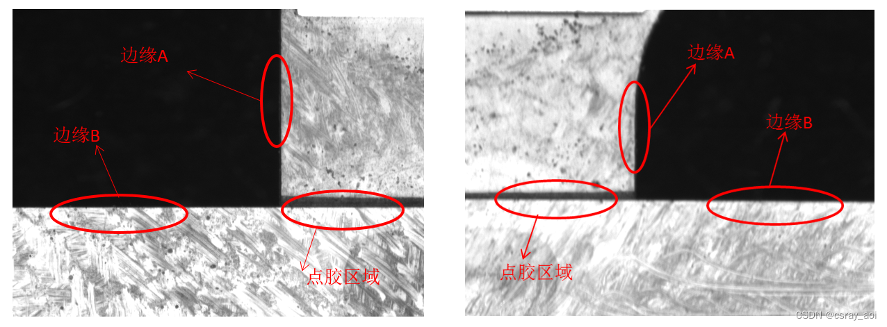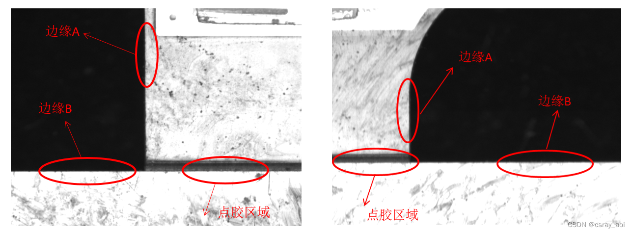 兩張圖片為一個產品點膠部位的左邊和右邊。通過邊緣A和邊緣B這兩條線可以找出交點位置做為定位點(產品不平會造成圖像模糊的情況)