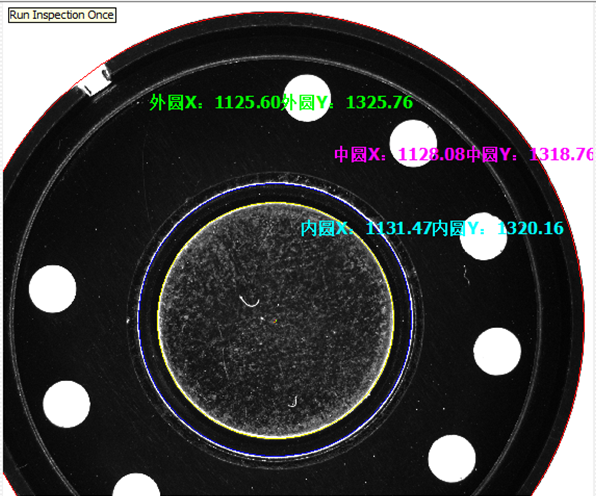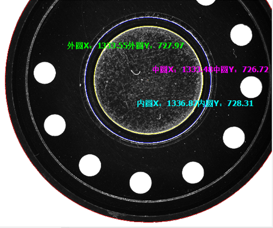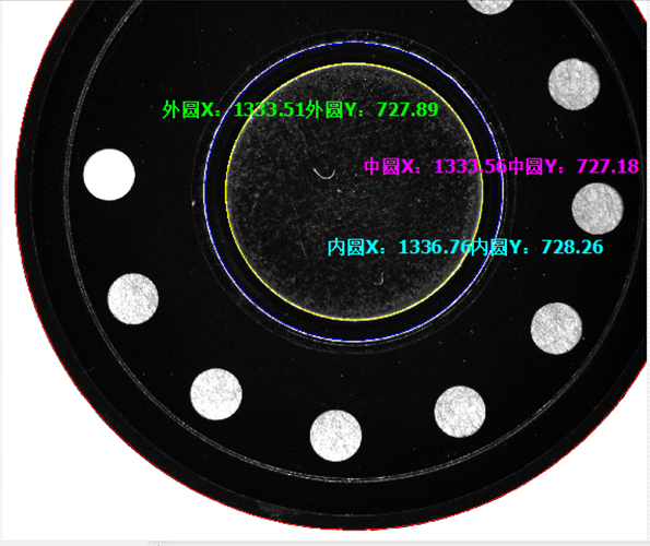 同一產品,在不同位置及光源亮度下進行測量,可以發現圓心位置偏差大概在3個像素左右。對於產品本身是否OK未知,但是穩定性,還是可見的,通過前三圖可以得知(最後一幅圖因產品位置變化較大,會引起光學效果的變化;又因為外圓邊上有缺口,對外圓的擬合會造成一定的影響,因此外圓與中圓也有3個像素的變化,前麵的圖中外圓與中圓是變化小於1像素)。