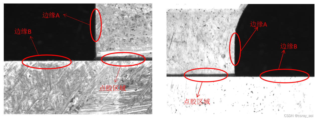 兩張圖片為一個產品點膠部位的左邊和右邊。通過邊緣A和邊緣B這兩條線可以找出交點位置做為定位點(產品不平會造成圖像模糊的情況)