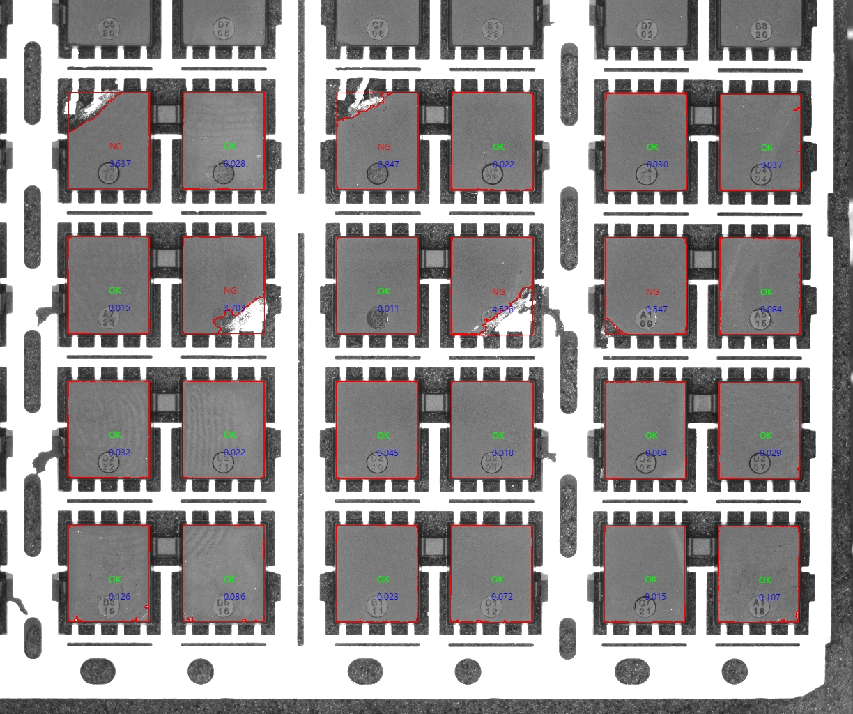 檢測PIN腳高低、缺失、歪斜、表麵粘錫等缺陷,以及平頭和圓頭PIN腳位置是否正確